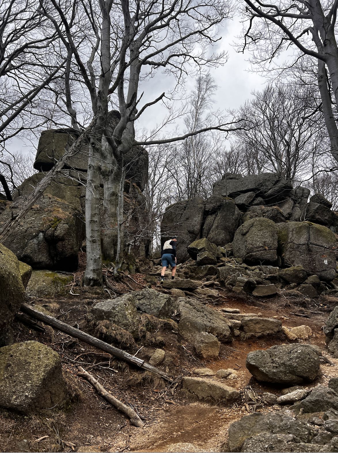 Auto jsme nechali v Hejnicích a vyrazili kolem kláštera po červené. Hned za městem se v krajině „povalují“ obří kameny. Je vidět, že tu děcka pořád staví domečky a rozdělávají ohně. Musíme sem vzít i naše děti, ať probudí své vnitřní architekty.