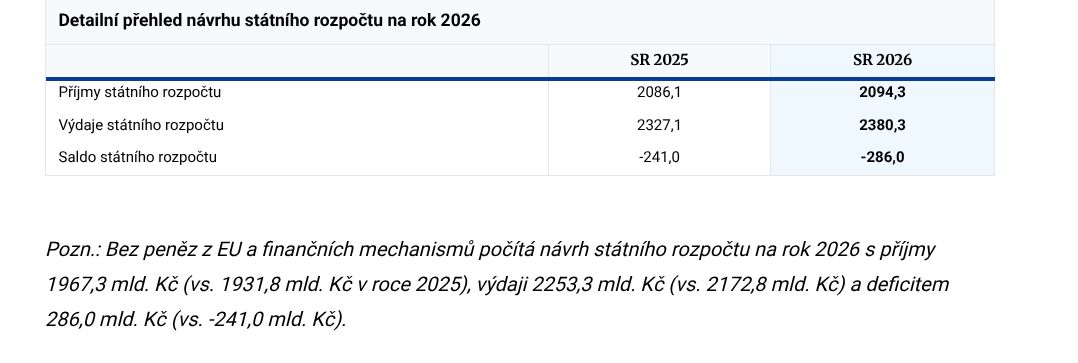 Vláda odsouhlasila upravený státní rozpočet na rok 2026. Ponížila výdaje na obranu o 21 miliard, odebrala z návrhu půjčku společnosti ČEZ na dostavbu jaderné elektrárny Dukovany a navýšily se také mandatorní výdaje resortu práce a sociálních věcí, zatímco ministerstva kultury a životního prostředí přijdou o více než 5 miliard korun. Zajímavý je také pohled na rozpočet Pražského hradu, který se snížil z 503 milionů korun v roce 2025 na pouhých 420 milionů navržených pro letošní rok.