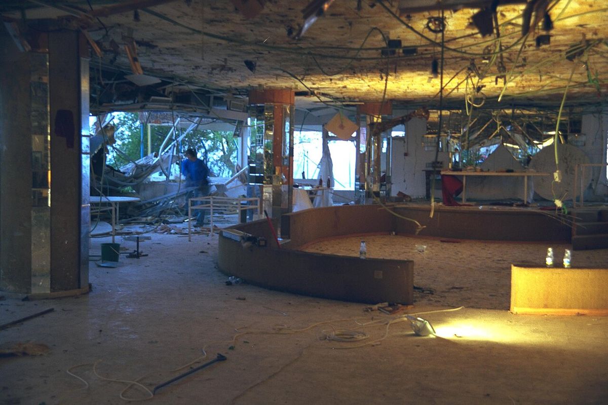 Zničená hala hotelu Park Hotel v Netanje - dílo Abdulláha Bargútího a Muhammada Odera