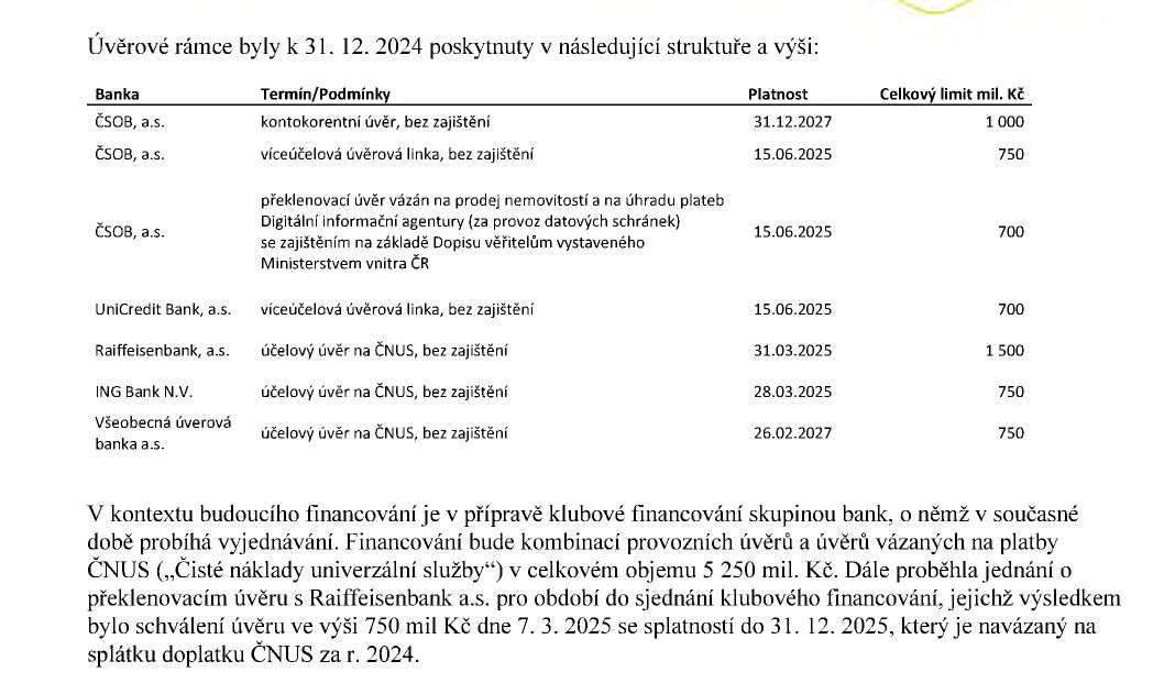 Co v pořádku není, jsou úvěry. Je patrné z komentáře výroční zprávy, že si Česká pošta půjčuje od bank, aby těm stejným bankám zaplatila úvěry, na které nemá peníze. Zajišťuje si od Raiffeisenbank překlenovací financování po mezidobí do vyjednání dalšího úvěru - zmíněného klubového financování - a z tohoto úvěru splatí jiné úvěry. Pošta si půjčuje, aby mohla splatit jiné půjčky. Zároveň hospodaří s ohromnou ztrátou, kterou kryje rozprodejem svého majetku a státním financováním, jinak by ztráta nedosáhla 1,3 miliardy, ale násobně vyšších čísel. Mzdové náklady neklesají, výkonová spotřeba neklesá, ale klesají tržby, a to zcela zásadně.