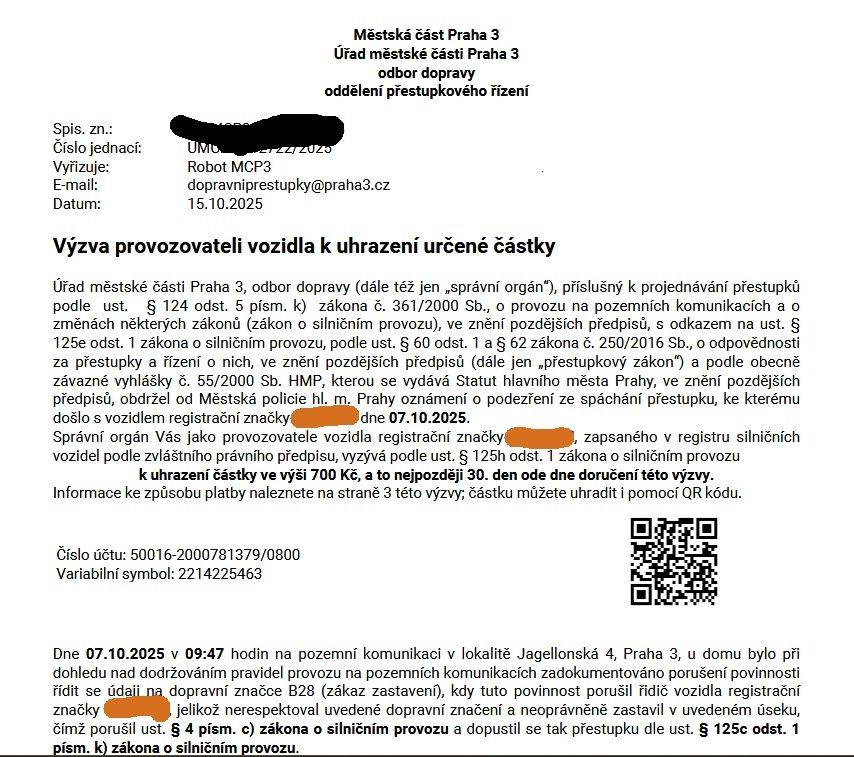Pokuta vypadá jako běžný dopravní přestupek. Robot MCP 3 uvádí, že řidič spáchal přečin tím, že zastavil na zákazu zastavení (B28) a uvádí dokonce, že je na místě i dotyčná značka.