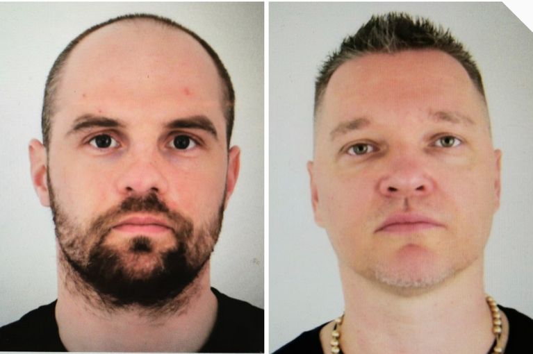 Ján Kaľavský vlevo a Peter Košč vpravo na policejní fotografii během pátrání roku 2021. Kaľavský se skryl v Bosně a Košč nejprve v Africe a posléze podle médií v Kanadě. Ani jeden z obviněných nebyl zadržen, oba před policií uprchli.