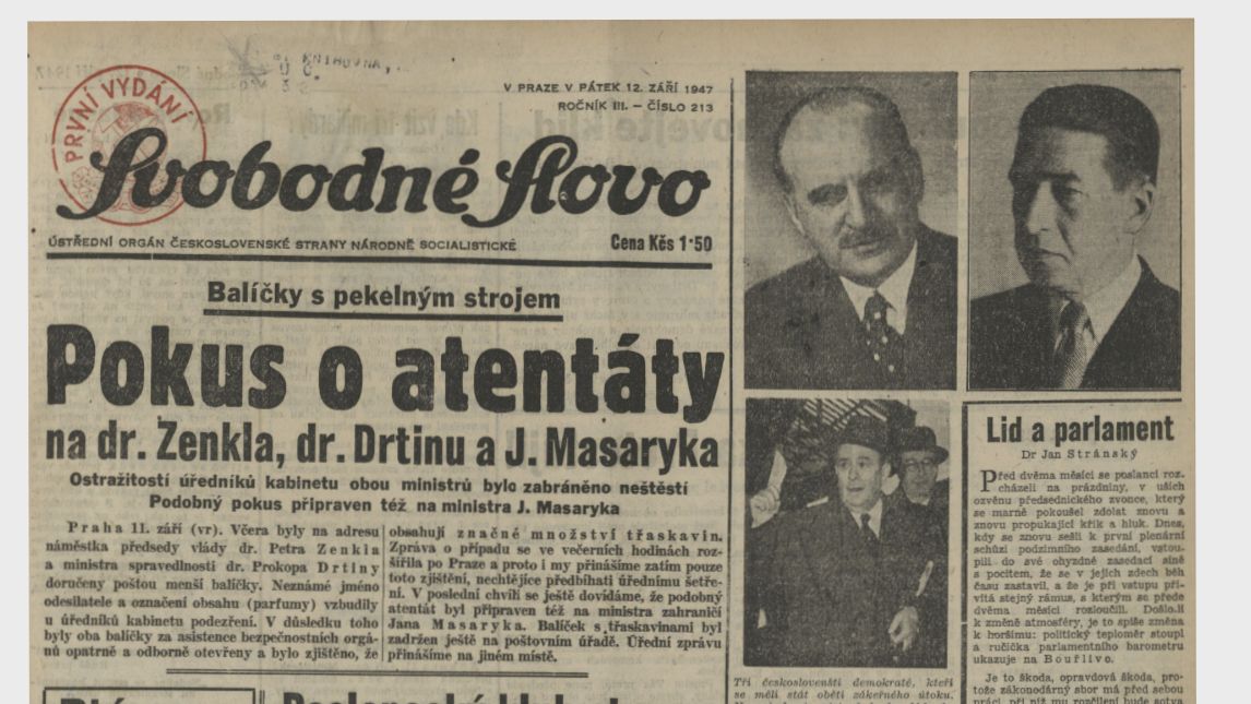 Je 10. září 1947 ráno a do kanceláří tří členů tehdejší vlády – místopředsedy kabinetu Petra Zenkla, ministra spravedlnosti Prokopa Drtiny a ministra zahraničí Jana Masaryka – přináší pošťáci zabalené balíčky, na kterých je uvedeno, že uvnitř jsou parfémy.