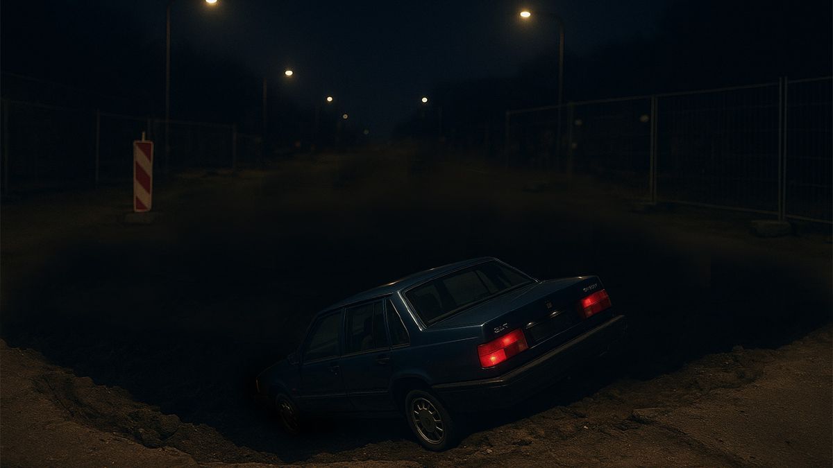 Po této sérii zvukových vjemů jsem samozřejmě spěchal k oknu, abych se podíval, co se stalo. Pohled, který se mi naskytl, byl opravdu interesantní. Z vyhloubené vrstvy mostního betonu trčela zadní část starého Volva 740, zatímco přední část vězela zabořená do směsi písku a kamení na dně jámy. Mohutné tmavé hranaté auto ještě pár vteřin blikalo světlomety, než úplně zhaslo. To ale nebylo všechno. Ozvalo se táhlé skřípění a zvuk typický pro otevírání rozklížených dveří. Z auta pomalu vylezl vysoký chlapík v bílém obleku a bílém klobouku. Jeho podivný zjev ještě dotvářely dlouhé tmavé vlasy a - sluneční brýle. No, hochu, kdyby sis je sundal hned po západu slunce, nemusel jsi tady teď kroutit hlavou, pomyslel jsem si. I přesto to musel být velký umělec, když po ignorování červenobílých sloupků a proražení plotu na staveniště pokračoval nevzrušeně kolem stavebních buněk, pytlů cementu a hromad písku až do „jámy lvové“. Ale vše se vysvětlilo už po pár vteřinách jeho pobytu na pevné zemi. Chlápek vrávoral a zakopával, až se konečně dostal kus od auta a opřený o jakýsi nosník zkoumal stav svého vozidla z dálky. Volvu se na první pohled nic moc nestalo, koneckonců, bylo to docela bezpečné švédské auto. Zato jeho majitel, zdálo se, byl opilý jak zákon káže. Celá situace samozřejmě i díky zvukům přilákala pozornost osazenstva rohové hospody, která byla od místa nehody pouhých pár metrů. Ze dveří se vysypalo asi tucet osob se zhruba stejnou hladinkou alkoholu, jako měl jezdec v jámě. Ten se k nim po chvíli otočil a navázal komunikaci. Díky podobnému opojení mezi nimi brzy opadly všechny bariéry a náš řidič se s nimi bavil, jako by se znali odjakživa. Aby se jim lépe povídalo, pár restaurace hostů natáhlo ruce do jámy a vyzdvihli svého nového kumpána z jámy na chodník. Světák v bílém obleku neváhal, poplácal se se štamgasty po zádech a společně vesele zapadli do hospody na další rundu.