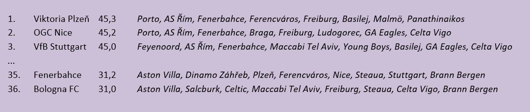 Kluby Evropské ligy podle koeficientu obtížnosti soupeřů. Napravo seznam vylosovaných soupeřů.