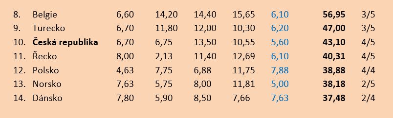 V koeficientu sice Poláci šlapou, ale dohnat by Česko neměli. Modře současná sezóna, vlevo od ní sezóny předchozí, tučně součet, zcela vpravo aktivní/všechny kluby v pohárech.