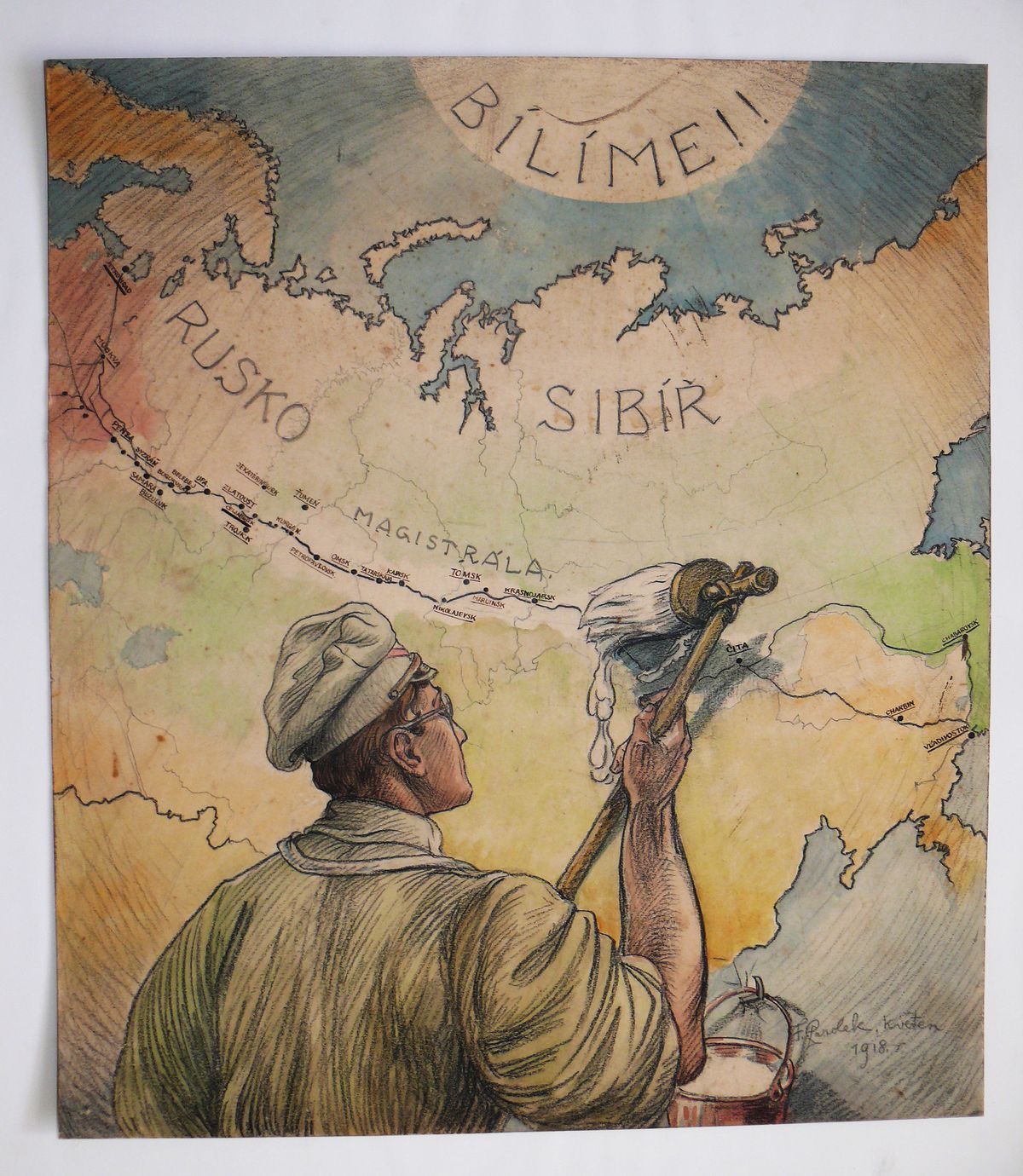 Ideologický obraz „Bílíme!!“ od Františka Parolka z května 1918 ukazuje legionáře natírajícího bílou barvou části Transsibiřské magistrály.