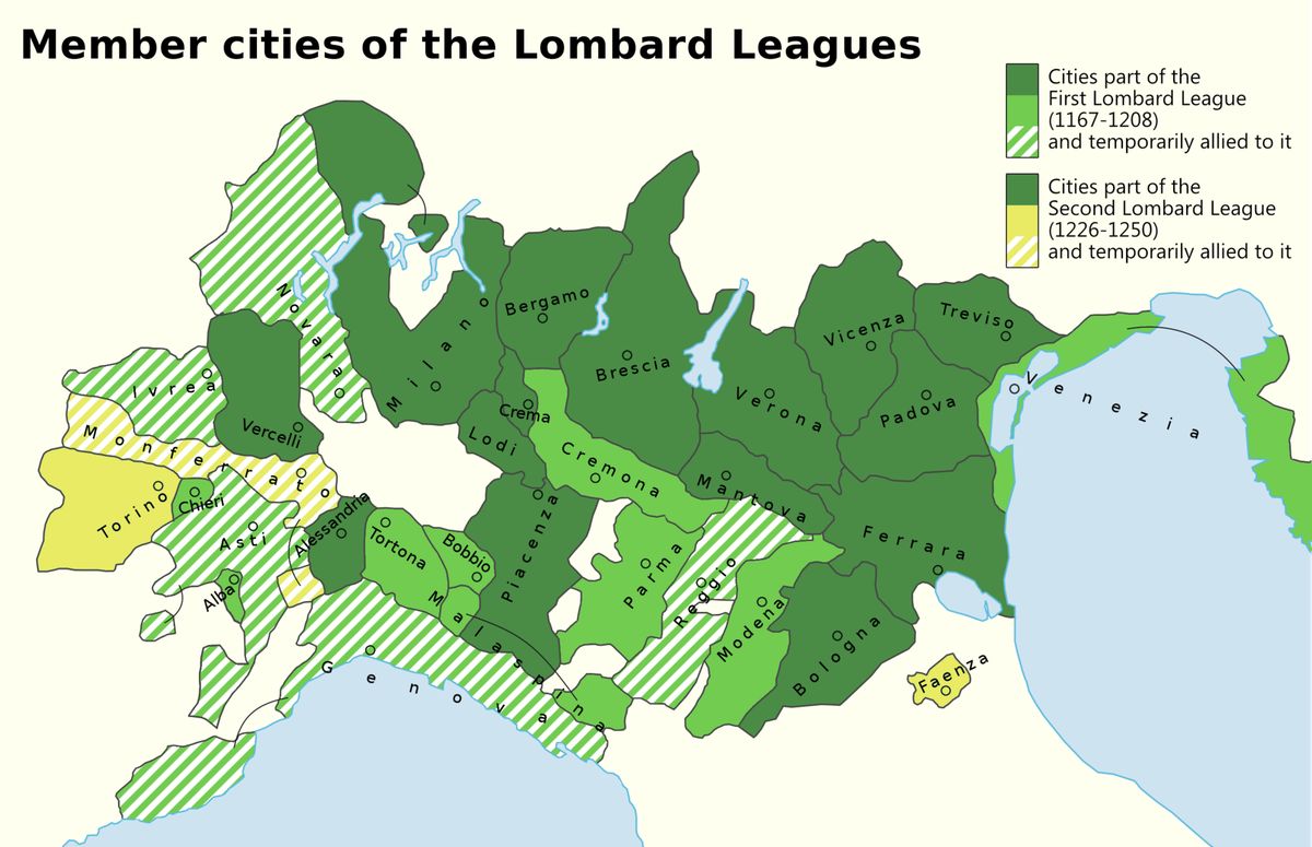 Města tzv. Lombardské ligy, která se postavila proti císaři Barbarossovi. Konflikt, jehož se účastnil Vladislav, vypukl ještě před jejím ustavením.