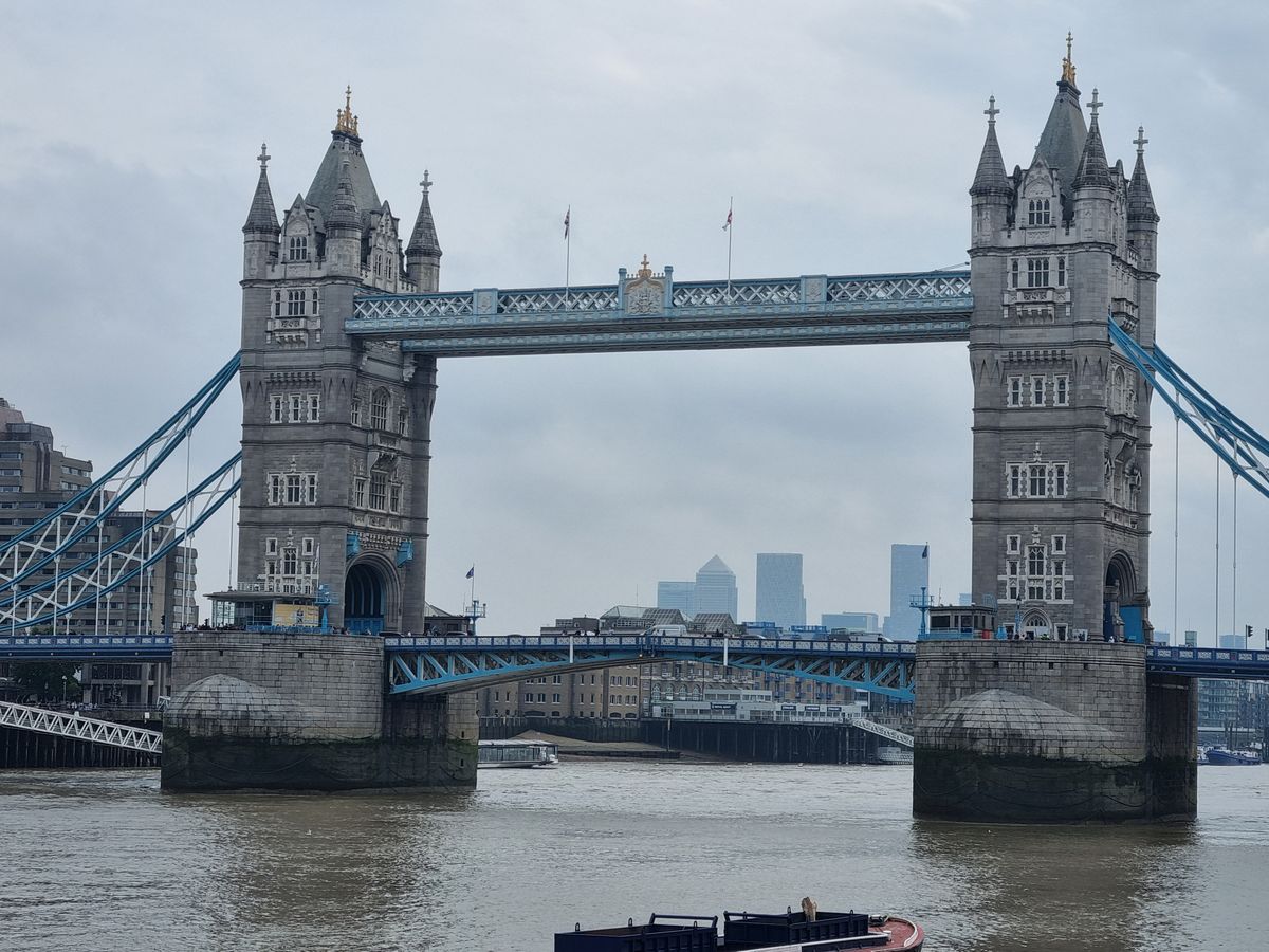 Hned vedle je ikonický Tower Bridge. Tenhle dvoupatrový most byl otevřen v roce 1894, v době, kdy Británie vládla světovým mořím. Dnes po něm kráčí turisté z celého světa, dříve po něm jezdily parní vozy a kočáry královské rodiny. Málokterý most tak přesně vystihuje spojení starého a nového světa. Při pohledu na východ máme po levé straně Tower a napravo moderní zástavbu centrálního Londýna.