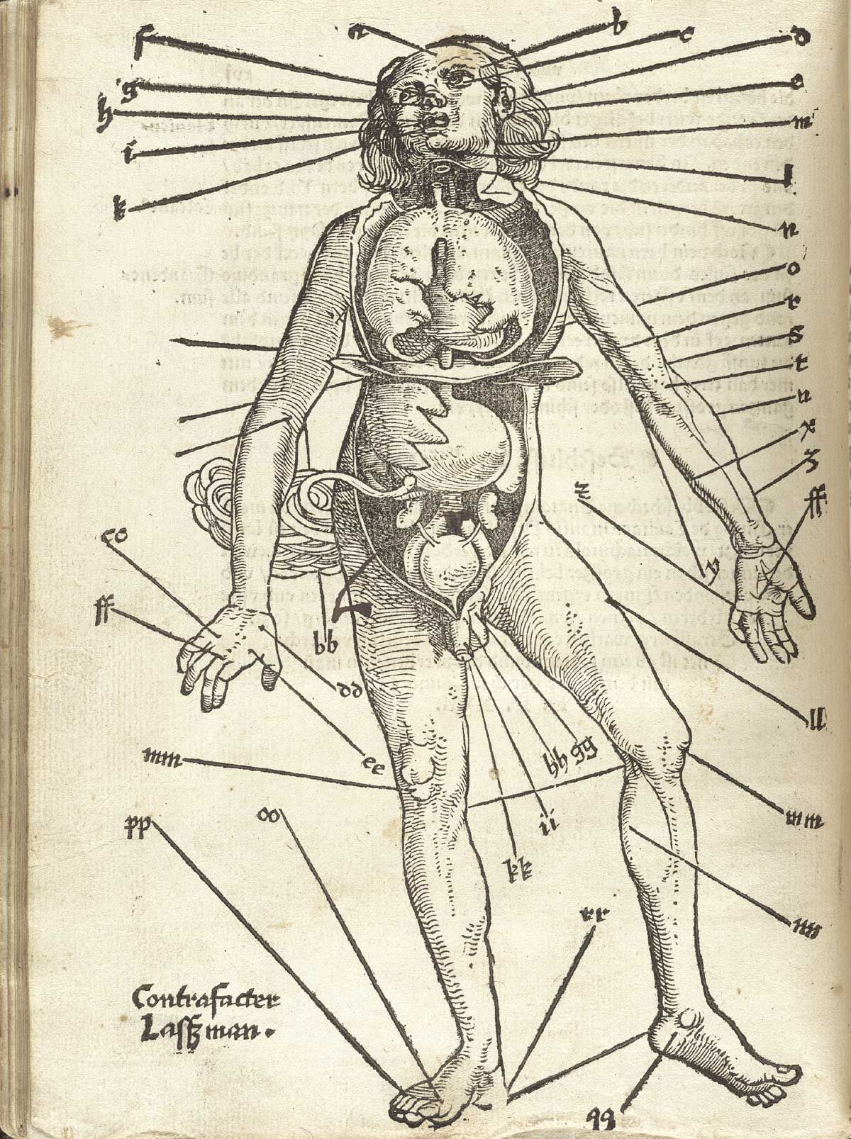 Ilustrace z lékařské knihy ze 16. století. Každá nemoc měla správné místo na těle, odkud se při ní měla odpouštět krev.