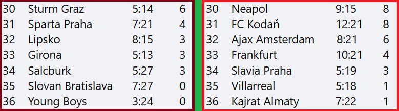 Srovnání loňského umístění Sparty a letošního umístění Slavie v Lize mistrů. Skóre bylo takřka totožné.