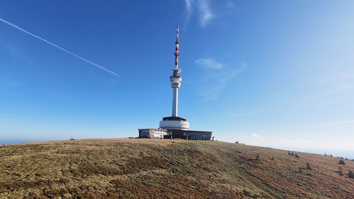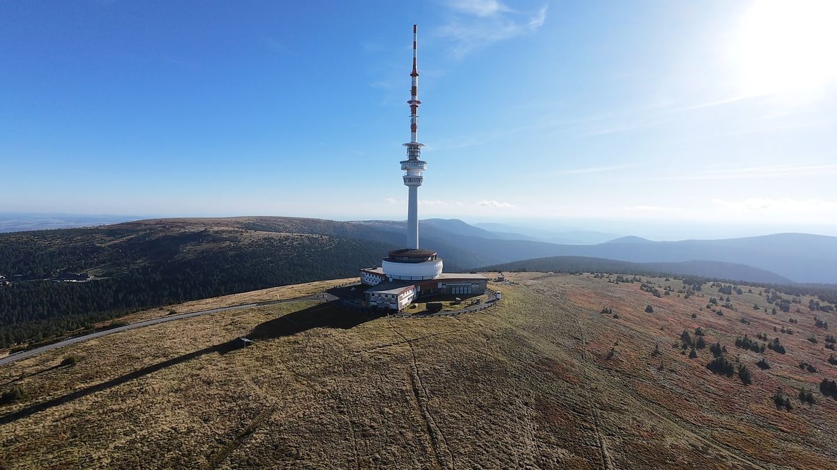 Ale už dost povídání, protože nás čeká další výšlap, a to rovnou na Praděd do nadmořské výšky 1491 metrů. A to je vrchol dnešního výletu, a to doslova a do písmene. Výhledy z věže vysílače na Pradědu. A výhled je tu při dobrém počasí do všech stran. Takže jsou vidět Krkonoše nebo třeba Vysoké Tatry. Ale i ty výhledy do okolí stojí za to, třeba na horní nádrž přečerpávací vodní elektrárny Dlouhé stráně. Veřejná vyhlídka je ve výšce 73 metrů nad zemí.