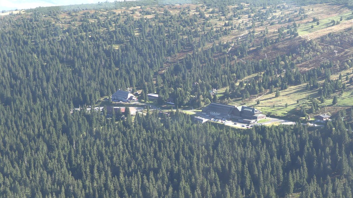 Pohled na Ovčárnu z vyhlídkového ochozu na Pradědu