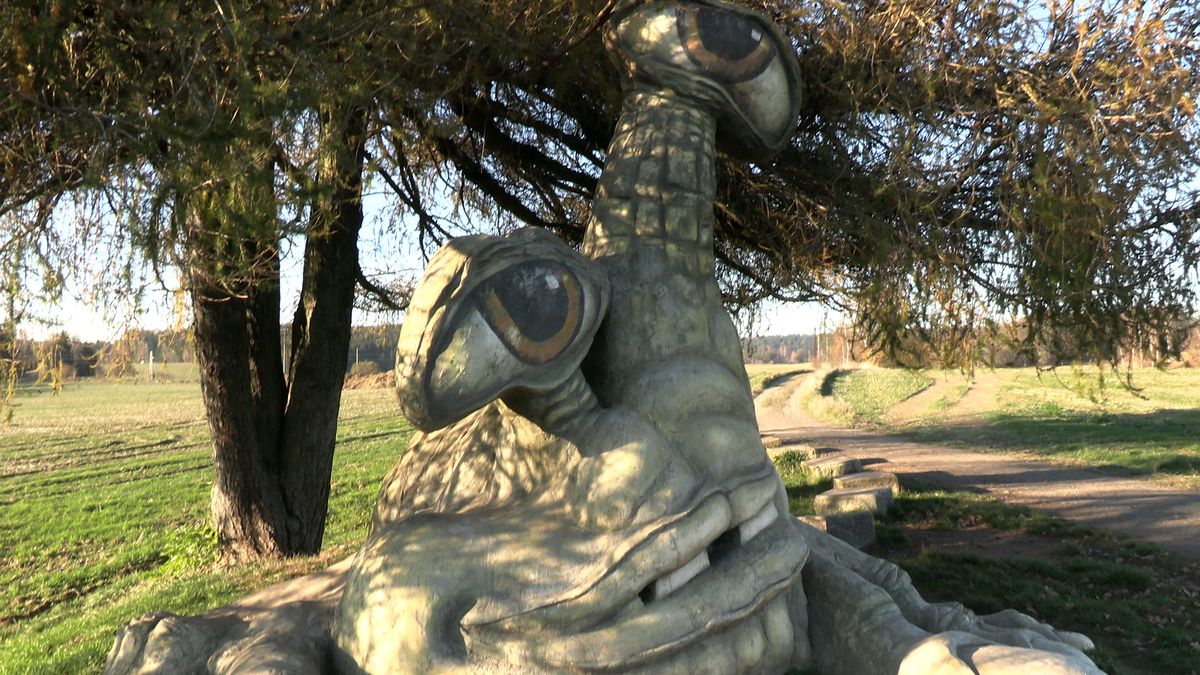 Pokračujeme dál Hamerským okruhem a přicházíme k další soše, tentokrát Hamroň, což je kříženec šneka a žáby. Hezoun, nemyslíte?