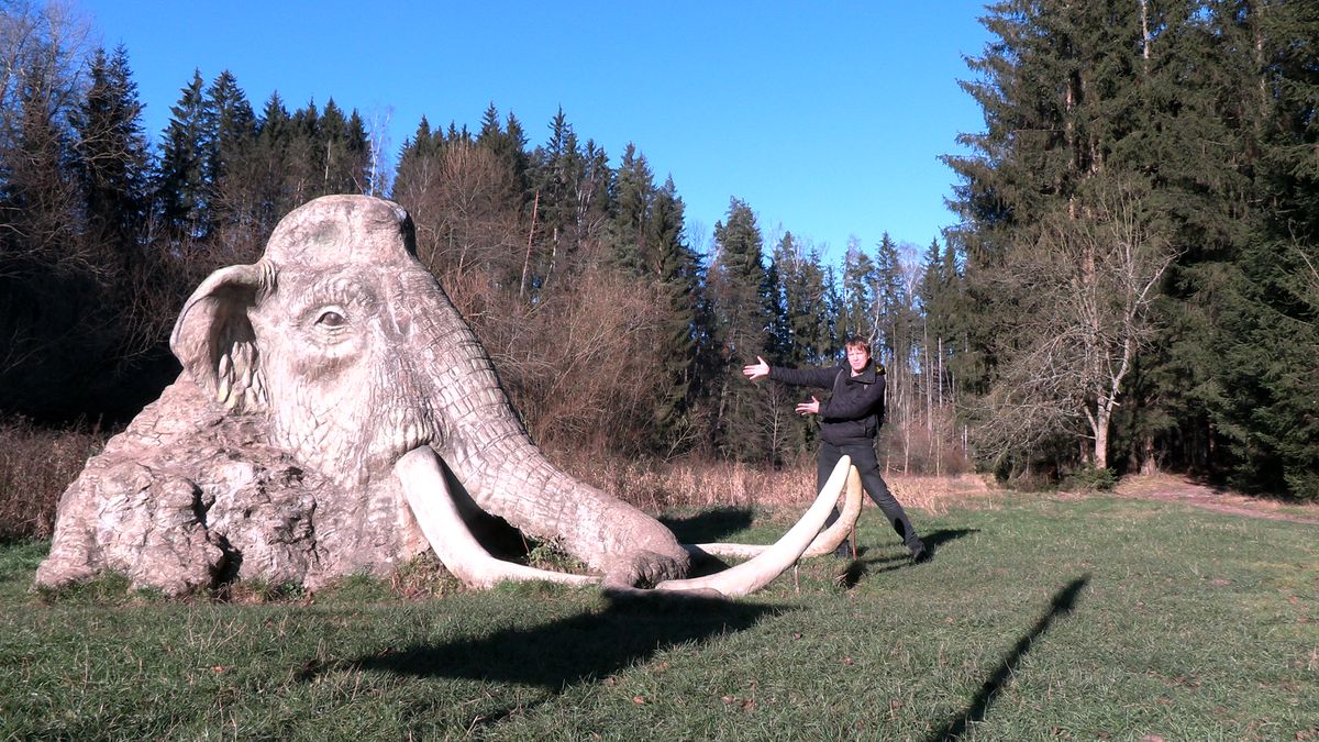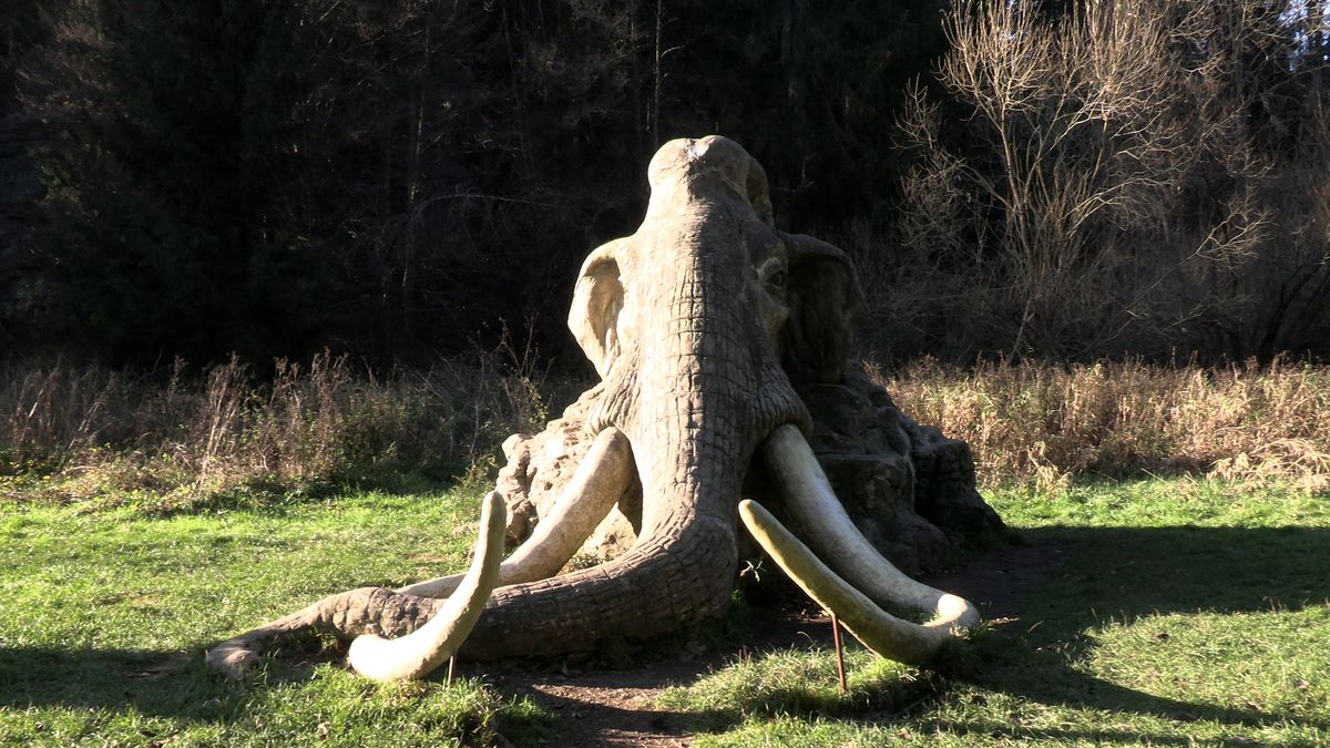 A my už potkáváme první sochu Michala Olšiaka a myslím že nemusím napovídat – tohle je Mamut. Obal sochy mamuta je z betonu, ale vnitřek je vyplněn vším možným. Je zde od roku 2006.