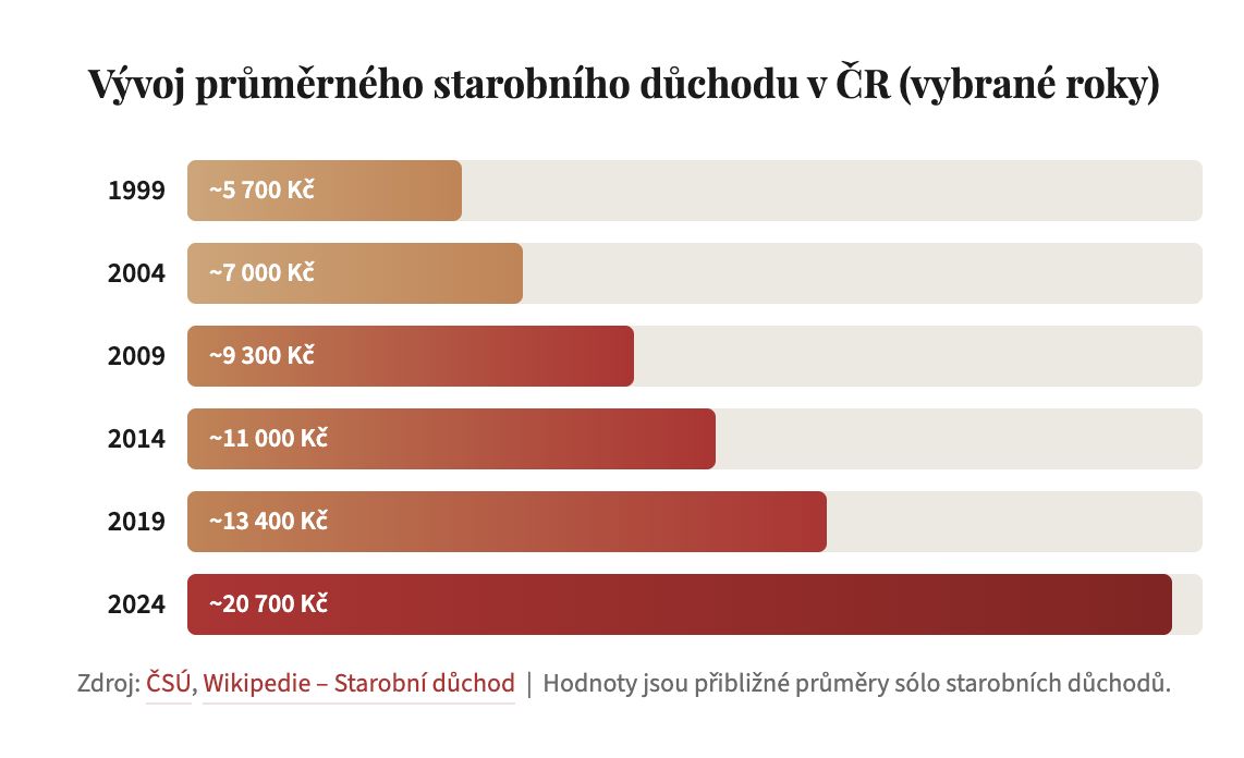 Zdroj: ČSÚ, Důchody, Wikipedie, Starobní důchod. Hodnoty jsou přibližné průměry sólo starobních důchodů.