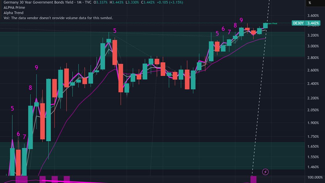 Sazby na německých dluhopisech atakují na 3,5% u třicetiletých, což ukazuje setrvalý trend růstu a rostoucí obavy investorů z půjčování Německu. Tento vývoj není dočasný, ale souvisí s vyššími výdaji na obranu a infrastrukturu, které tlačí na rozpočet a zvyšují riziko pro věřitele. Investoři tak jasně signalizují, že vidí v německé fiskální politice rizika, která mohou vést k dalšímu zdražení dluhu.