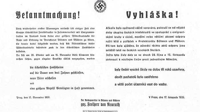 16.listopadu se v Berlíně konala porada za účasti Adolfa Hitlera, jejímž výsledkem bylo rozhodnutí o uzavření českých vysokých škol na dobu tří let, zatčení a popravení devíti vedoucích představitelů studentské organizace (Josef Adamec, Jan Černý, Marek Frauwirth, Jaroslav Klíma, Bedřich Koula, Josef Matoušek, František Skorkovský, Václav Šafránek a Jan Weinert) a internace stovek studentů v koncentračních táborech.