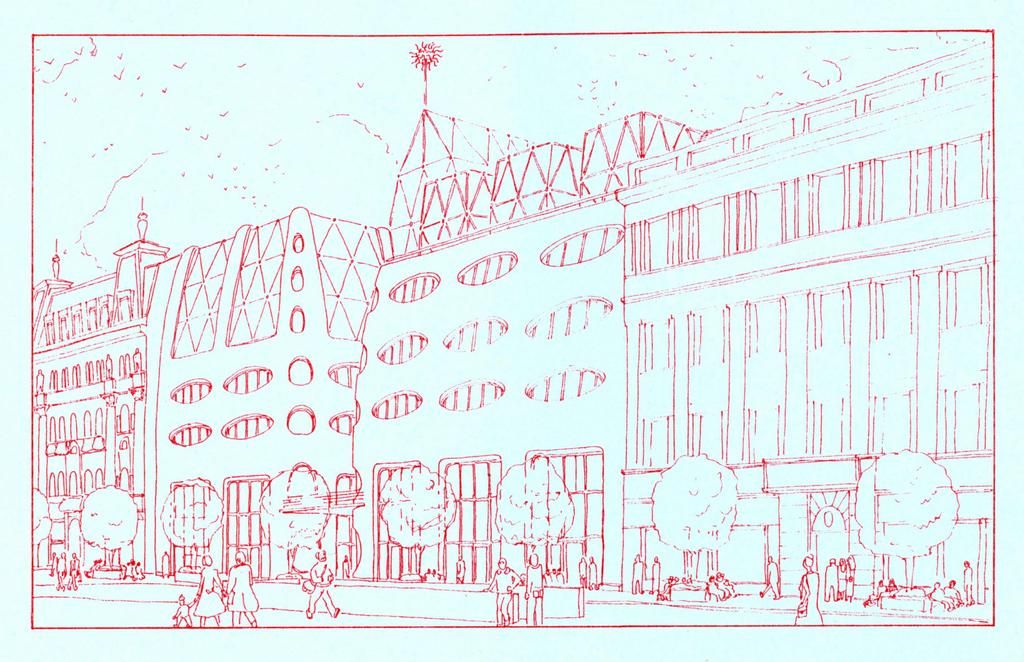 Porota si mého návrhu samozřejmě nevšimla, tou dobou se řešil nástup neomoderny, vyhrálo co vyhrálo, Hölzel a Kerel, vytěžení pozemku, zalomená nízká pasáž, nesrozumitelné fasády, popření osy na Týnský chrám. Mně bylo jasné, že se pohybuji na tu dobu v krajně vizionářské poloze cílené do příštího století, tak jsem to bral s nadhledem. Práci mi k mé radosti pochválilo pár kamarádů a velkým překvapením bylo, že si jí tehdy všiml i známý historik architektury Rostislav Švácha a ve své recenzi v Architektu můj návrh pochválil spolu s prací týmů Šrámková, Kupka a ADNS. Byl jsem z toho zaskočený, že jsem mu nestihl ani poděkovat a odebral se na civilní službu do ústavu pro nevidomé a mentálně postižené na Strahov na Palatu. Neználek ve Slunečním městě…