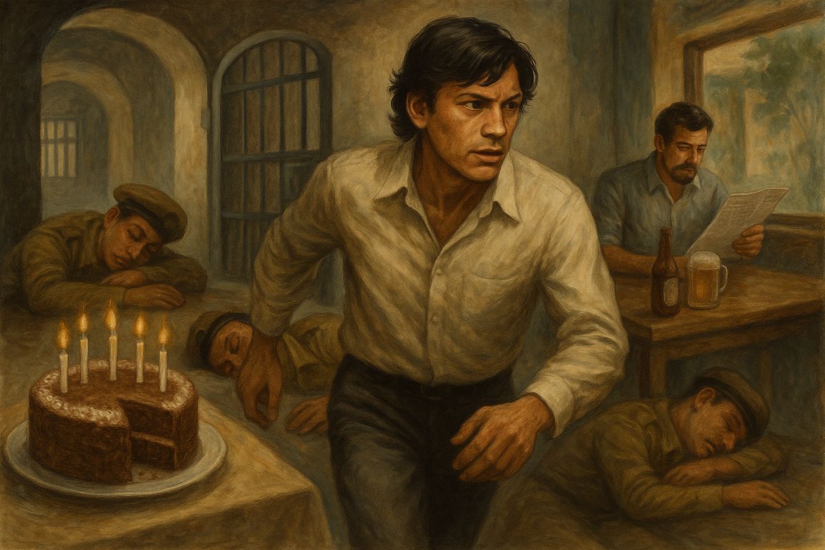 Útěk, o kterém se později psalo, nevznikl náhle. Připravoval ho dlouhé týdny, možná měsíce, z drobných gest: darovaných cigaret, milých slov, pozorností a ujištění. Potom přišla „oslava“ - dort, na kterém ležel cukr jako polétavý sníh a uvnitř neviditelné „něco“, co uložilo všechny strážce do krátkého a bezbranného spánku. Dveře se otevřely, chodby se protáhly, krok znějící jako ozvěna a Sobhraj prošel ven, jako kdyby se nic nedělo. V Goa, v restauraci, kde pil pivo a četl noviny, ho však později dopadli znovu. Jako by ho opustil anděl strážný. Anebo se prostě jen přepočítal.