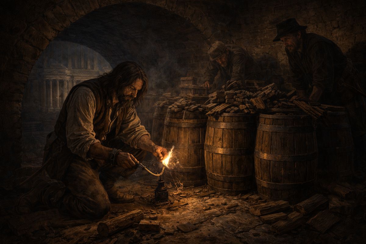Hlavní postavou spiknutí byl Robert Catesby. A plán byl naprosto jednoduchý: při slavnostním zahájení zasedání parlamentu vyhodit do vzduchu Sněmovnu lordů i s králem a nejvyššími představiteli země. Nešlo o atentát na jednu osobu. Šlo o pokus useknout hlavu státu jedním pohybem a v následném chaosu převrátit režim. Některé prameny mluví i o úmyslu unést královu dceru Alžbětu a udělat z ní „figurovou“ katolickou panovnici.