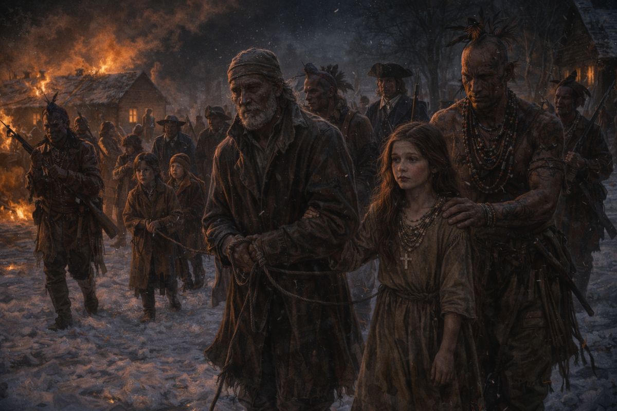 Eunice byla jednou z těch, které odvedli. Spolu s ní šel její otec, několik sourozenců a další obyvatelé Deerfieldu. Všechno, co znala – dům, jména sousedů, vůni čerstvě upečeného chleba i pocit, že ráno je prostě další ráno běžného dne – se během jediné noci rozpadlo na kusy. V zajateckých příbězích z té doby se často opakuje stejná věc: šok nebývá v tom, že člověka někdo odvede, ale v tom, že mu nikdo nevysvětlí proč a kam. Jen jde. A když jde moc pomalu, někdo ho popostrčí. Když se někdo rozbrečí, jiný mu řekne, ať je ticho, a jde se dál.