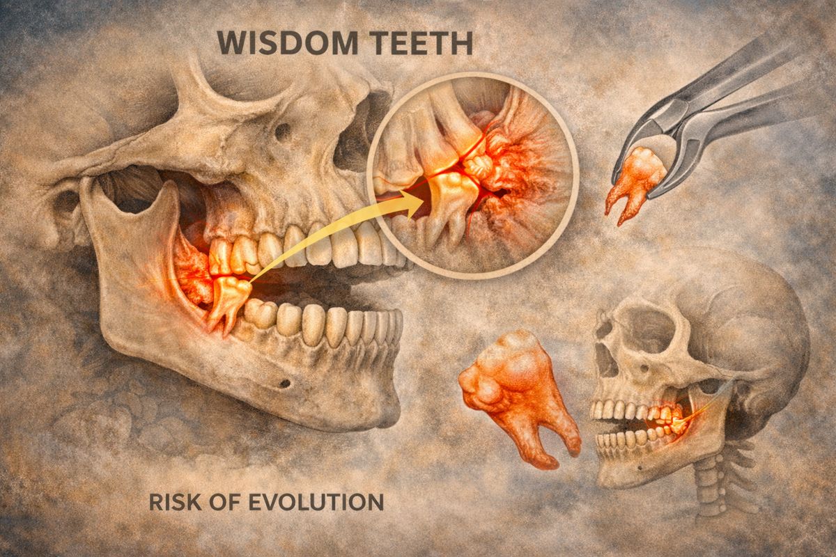 Výsledek řada z nás dobře zná - zub nemá kam růst, tlačí se, rotuje, zůstane zaklíněný, způsobí zánět. Někdy nic, někdy drama. Proč to evoluce „neopravila“ tím, že by zuby moudrosti prostě zmizely?