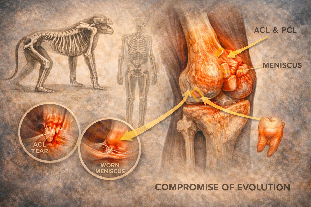 Koleno je součást celé kaskády kompromisů, které vznikly, když se zvíře původně chodící po čtyřech začalo narovnávat. Není to tak, že by člověk „dostal“ nový kloub. Člověk dostal upravený kloub. A v tom je ten rozdíl.