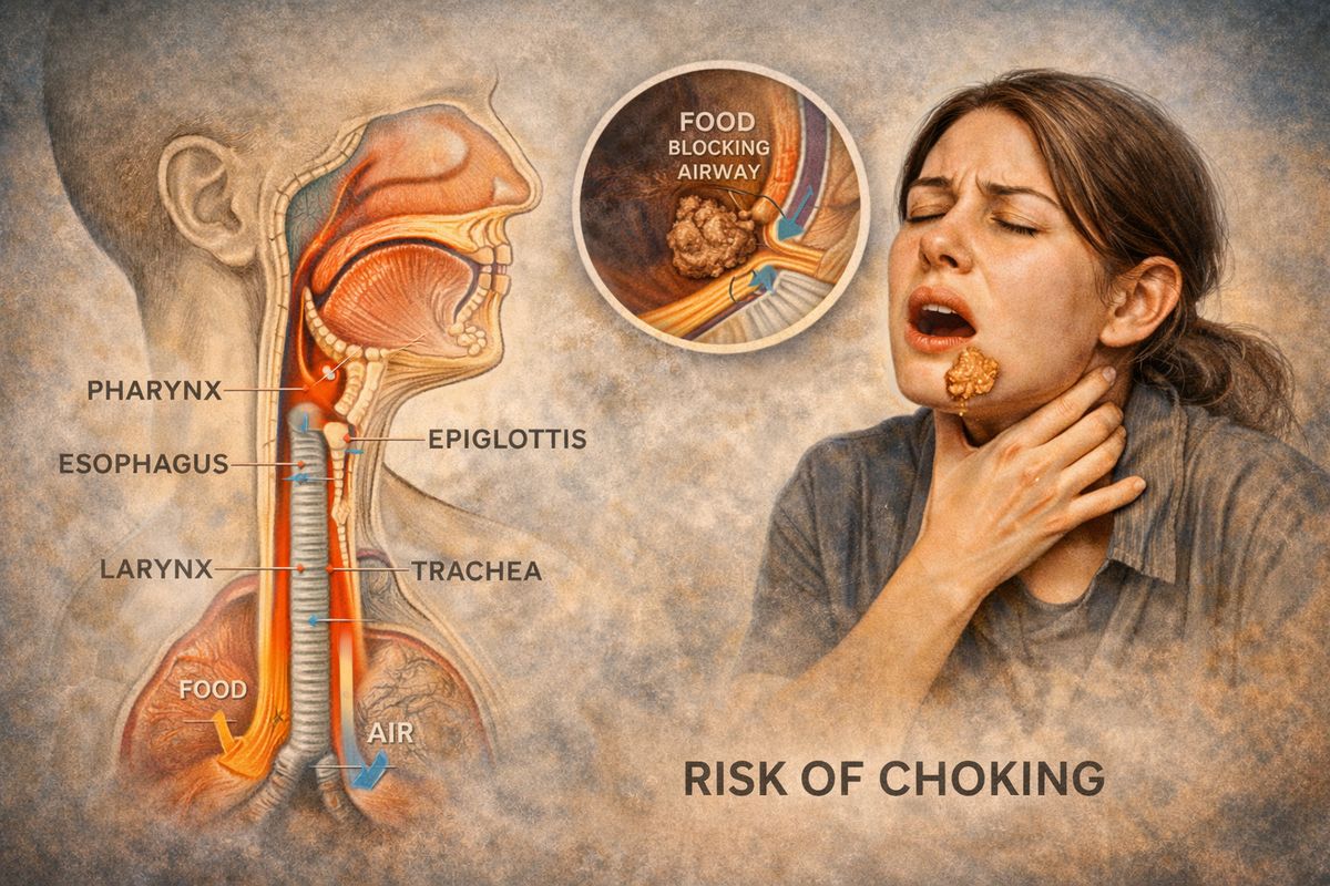 Dýchací a trávicí cesty se u člověka kříží v oblasti hltanu. Vzduch i sousto se potkávají na stejném „křižovatkovém“ místě. Když se něco pokazí v koordinaci polykání a uzávěru hrtanu, potrava může skončit v dýchacích cestách. Známe to snad úplně každý.