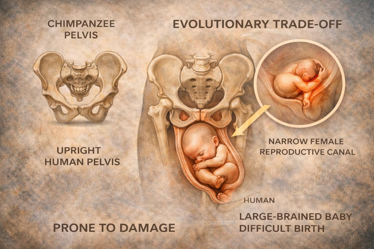 Pánev musí být dost stabilní pro chůzi a běh, ale porodní kanál musí být zároveň dost prostorný. Jenže prostor a stabilita jsou částečně proti sobě. Evoluce z toho udělala kompromis – a kompromisy bolí.