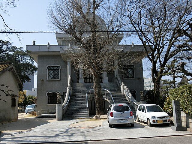 Ginkgo biloba před chrámem Hōsenbō, Tera-machi, Hirošima. Tento strom přežil výbuch atomové bomby a stal se jedním ze symbolů obnovy.
