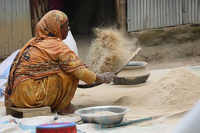 Bangladéšská žena prosévající rýži tradičním ručním způsobem