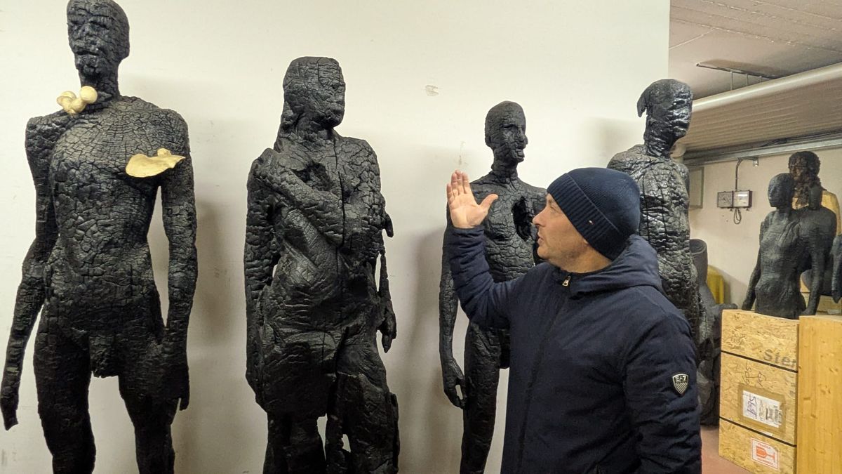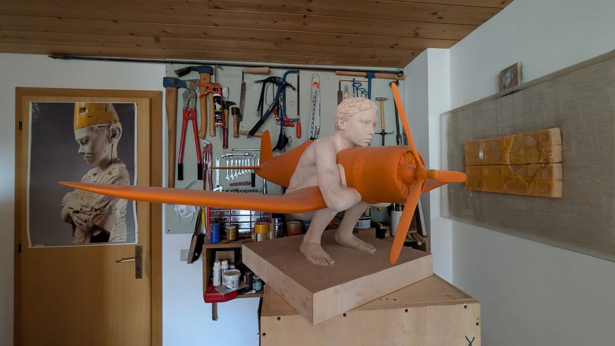 Ateliér má v suterénu svého domu, odkud velkým oknem shlíží dolů do údolí. Z reproduktorů se vznáší domem operní árie, okolo se tyčí mohutné sochy propojených bytostí. Často využívá jako model svého syna, třeba tady u krutého samuraje v kontrastu s čistým chlapeckým tělem. „Já pracuju povětšinou s lipovým dřevem, nechám si ho vozit z Chorvatska,“ ukazuje. Jeden z jeho posledních cyklů se jmenuje Život bez vánoc, pokud byste snad měli obavu, že to přeháníme s pánbíčkářskými motivy.
