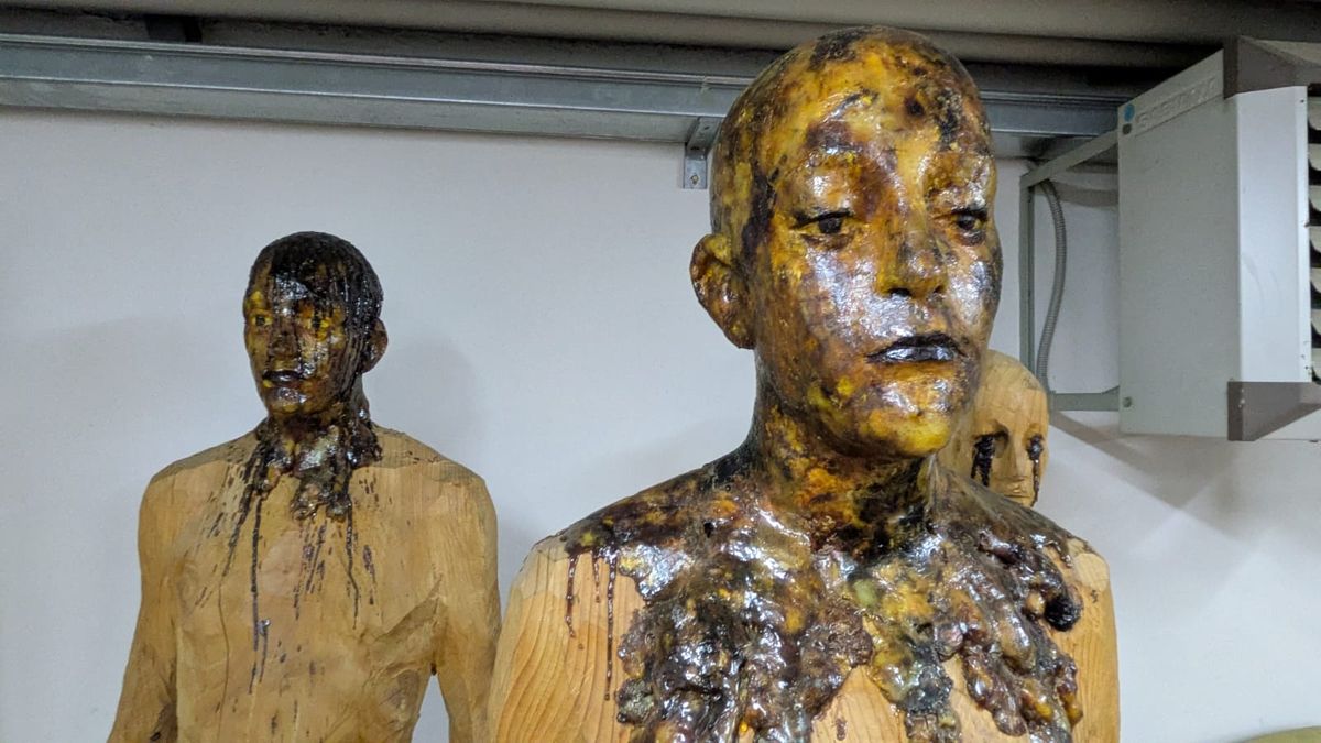Nejprve studoval tady doma ve Val Gardeně, později na akademii v Norimberku, dnes už i sám učí studenty v Carraře v Toskánsku. „V různých obdobích jsem střídal techniky, které mě zajímaly,“ vypráví. Začínal s realistickými sochami, natřenými akrylovými barvami, s lidskou tváří. „Hledal jsem v nich zrcadlo.“ Později se věnoval metamorfózám se stříbrnými nátěry, kde ho inspiroval fenomén Terminátora. Pak přešel k experimentům s materiálem, postavy pokrývá pryskyřicí, pracuje s vypáleným dřevem i bronzovými formami. Zde se až nabízí další universum, to z Vetřelce…