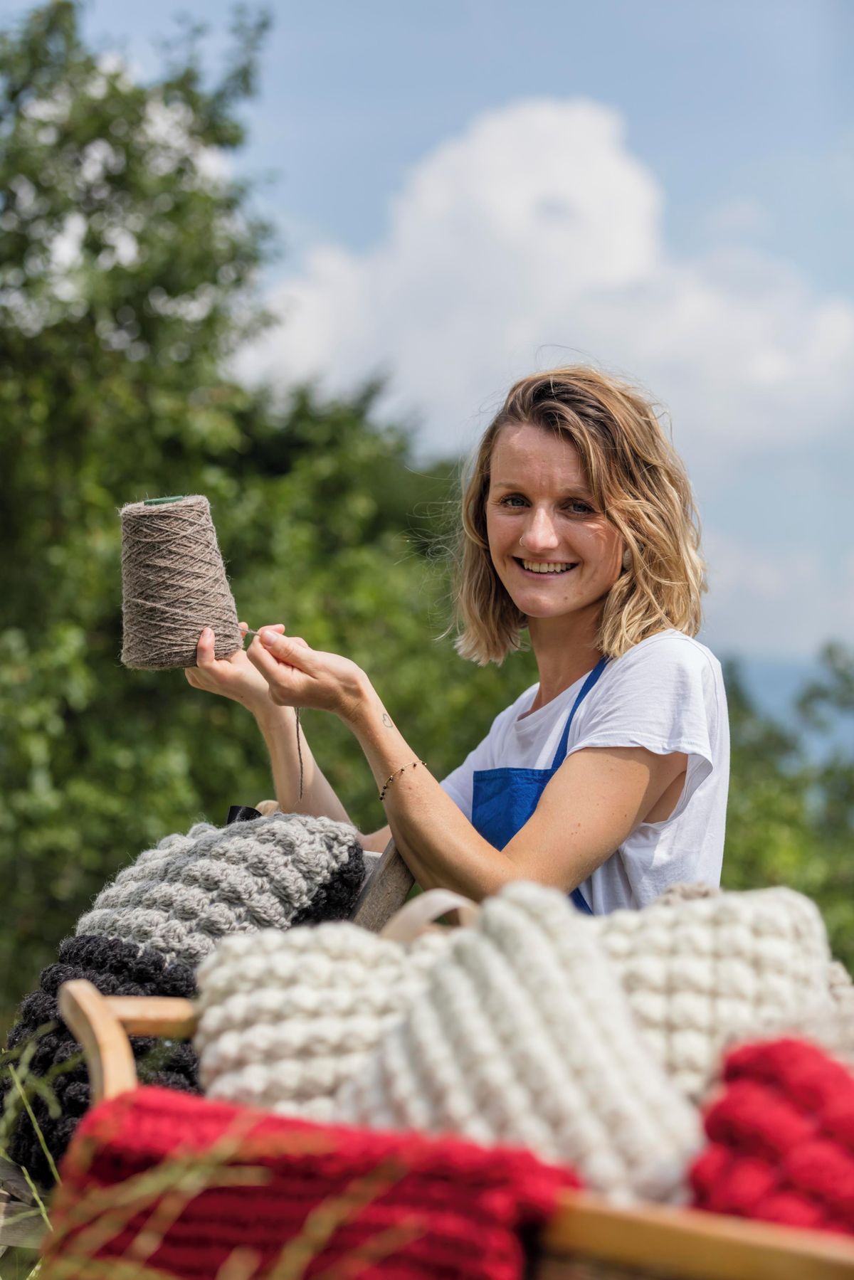 Johanna Aichnerová na své farmě Hoferhof v Lagundu pro Roter Hahn vyrábí háčkované výrobky z vlny. Chová ovce, z nichž získává většinu materiálu potřebného pro své výtvory. „Dohlížím na celý proces zpracování vlny: stříhám ovce, peru vlnu, suším ji, češu a předu. Poté ji háčkuju technikou, kterou mě naučila moje matka,“ ukazuje. Zpočátku musela překonat řadu obtíží, než dosáhla výsledků, které si pro svou práci představovala.