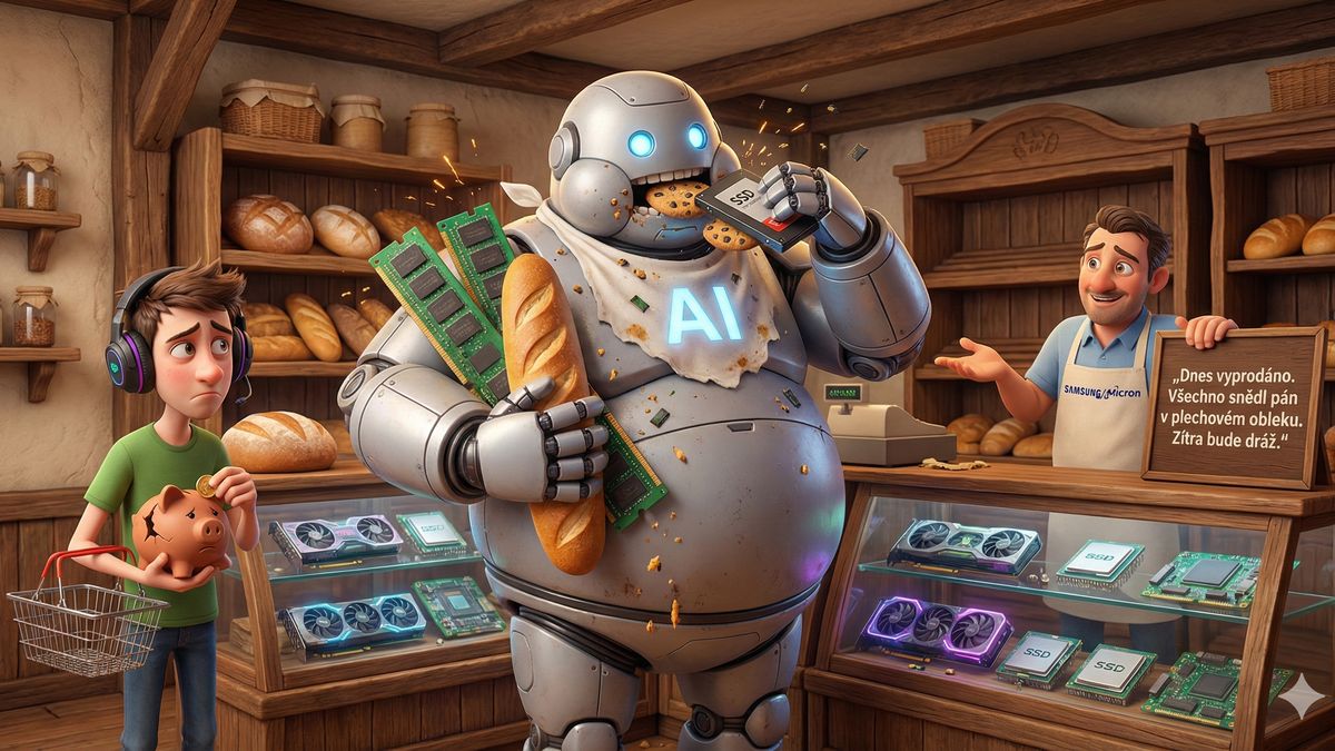 Představte si, že jdete do pekárny pro rohlíky, ale pekař vám řekne, že jeden stojí padesát korun. Proč? Protože všechnu mouku skoupil obří koncern na výrobu luxusních dortů. Přesně tohle se právě teď děje ve světě počítačů. Jen místo mouky je tu křemík a místo dortů nenasytná umělá inteligence (AI).