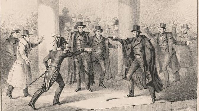 Richard Lawrence se napodruhé neúspěšně pokouší zastřelit prezidenta Jacksona. První zbraň již leží na zemi. 30. ledna 1835, Kapitol, Washington D.C.