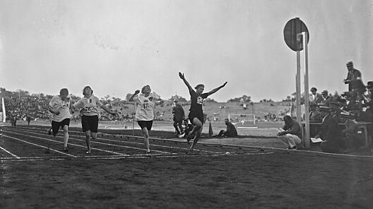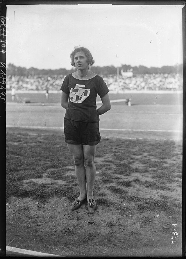 Marie Mejzlíková II po doběhu závodu na 60 m, v němž překonala světový rekord, 20. srpna 1922, Stadion Pershing, Paříž.