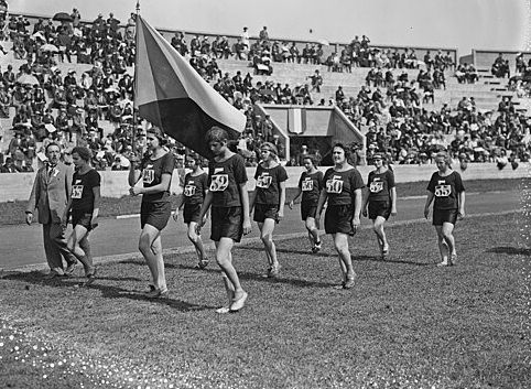 Výprava československých žen nastupuje v Paříži na Stadionu Pershing při zahájení Ženských světových her, 20. srpna 1922. Marie Mejzlíková II. uprostřed s čelenkou.