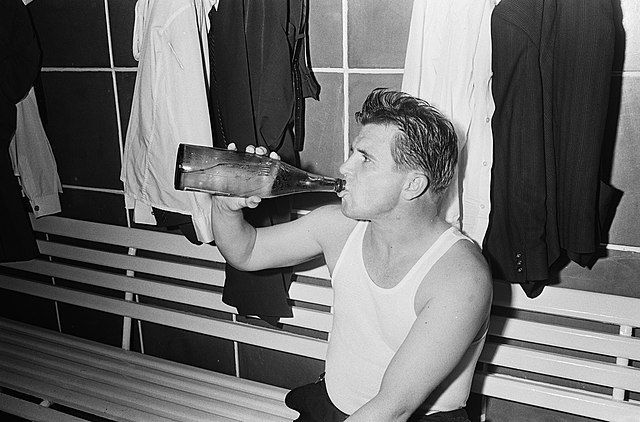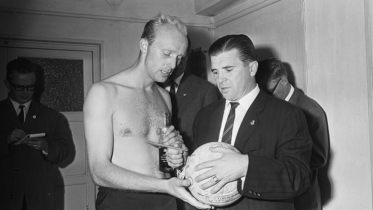 Ferenc Puskás neměl vždy vzornou životosprávu. Zde oslavuje v šatně triumf nad Feyenoordem v PMEZ. Real vyhrál 5:0.