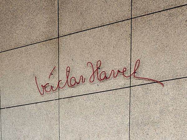 Plánuje se další budova F v místě, odkud vznikla tato fotografie, a budovy budou propojeny lávkou přes ulici ve tvaru lokomotivy s tenderem podle návrhu Davida Černého.