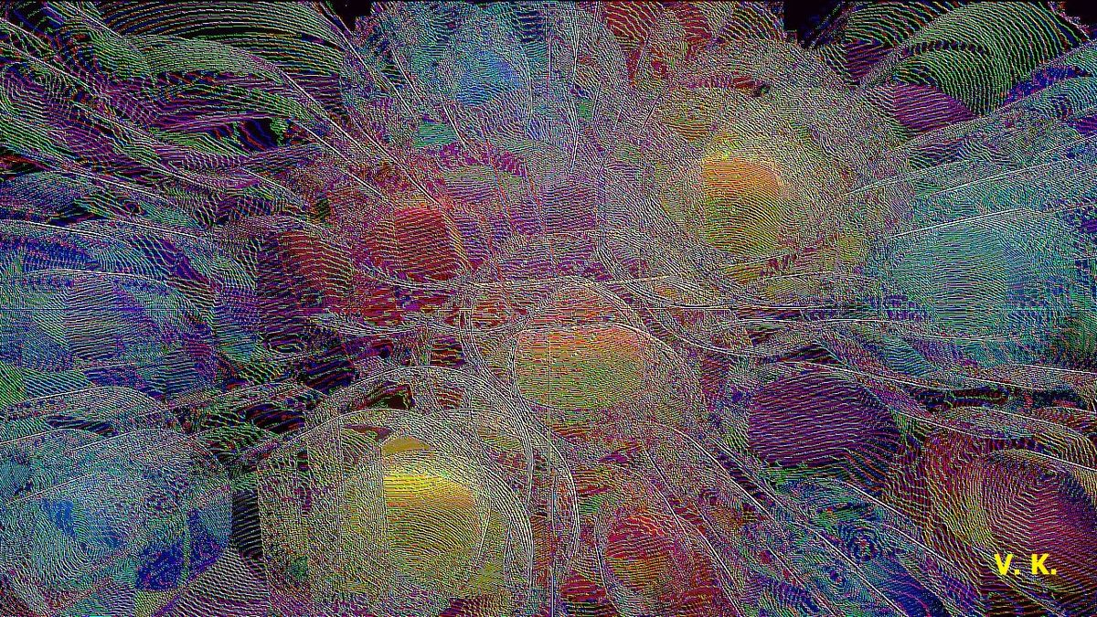 Dostávám se do fantazijního prostředí tajemného ještěra, který do něj kráčí. Dílo jsem vytvořil ze svých abstrakcí bublinek.