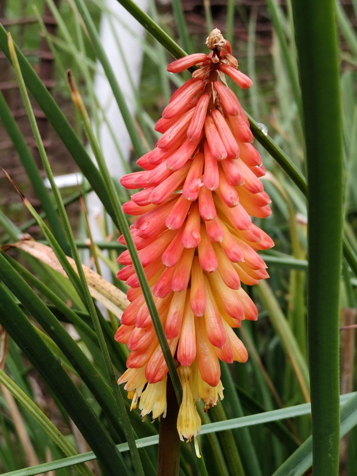 Ještě však zůstávají exotické cibuloviny před fasádou baťovského půldomku. Kniphofia v květu se mi objevila náhodou na zahrádce.