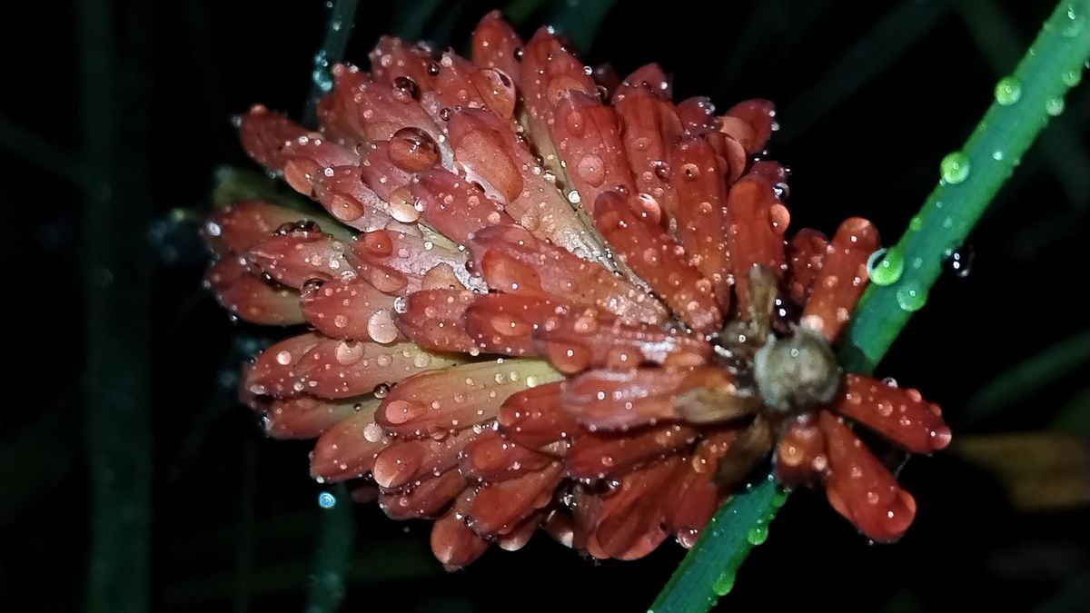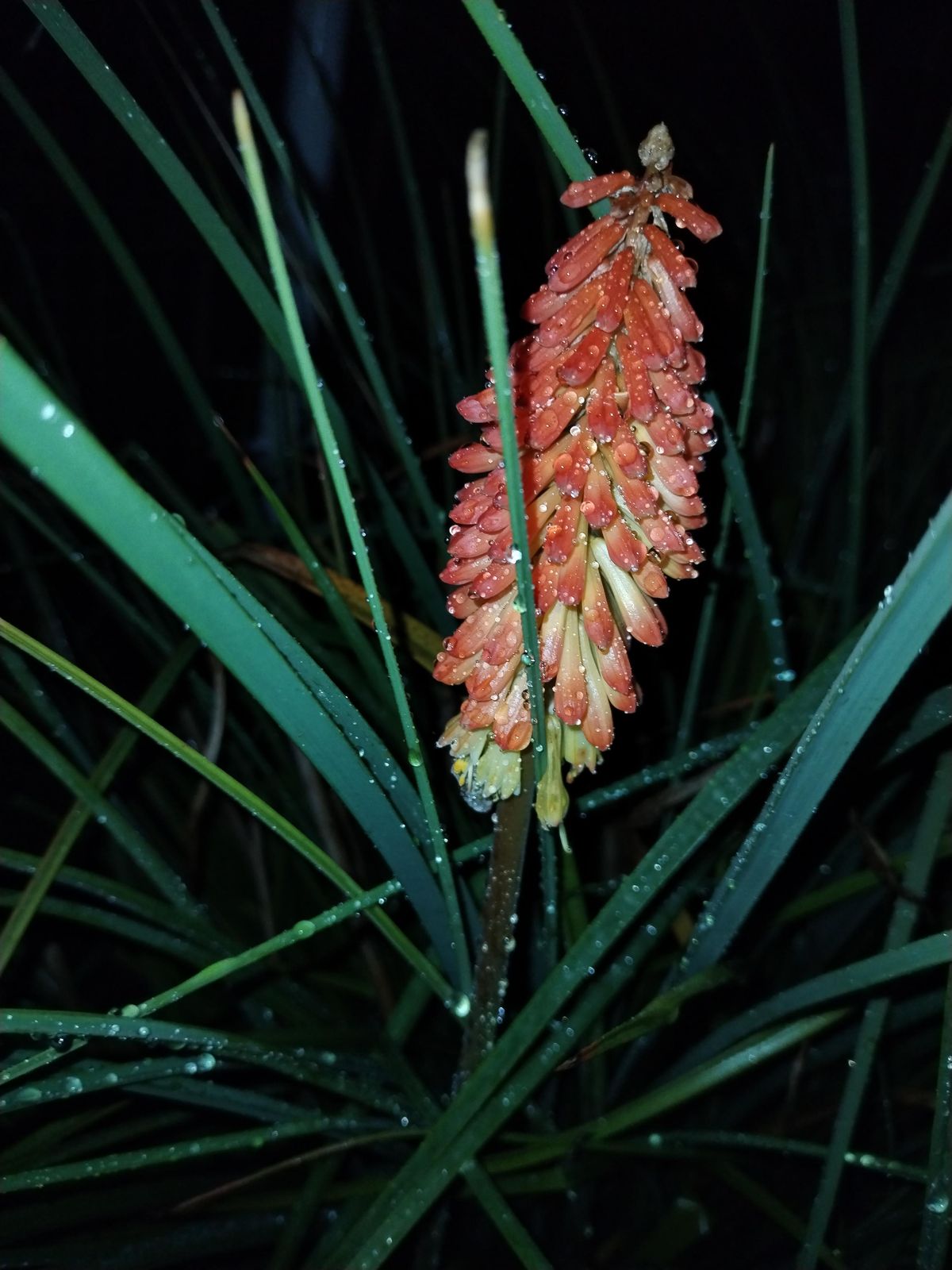 V noci jsem vyšel na zahrádku, kde pršelo, abych vyfotil kvetoucí rostlinu s názvem Kniphofia. Její náhodný květ byl ozdobený kapičkami deště, stejně tak listy. Je to nádherná exotická rostlina, která mi remontuje v říjnovém podzimu.