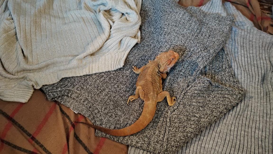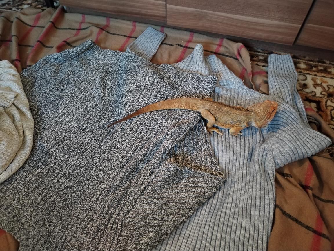 Dneska můj ještěří kamarád zavítal opět k pavoučkovi, aby si s ním popovídal. Také se Agi proběhl u nás doma v interiéru. Též navštívil strašilkárium, ocitl se pod židlí. Agi měl chuť lézt pod postel. Musel jsem na něj dávat pozor, aby se mi neztratil „v zapadlých“ koutech místnosti. Agi byl spokojený, proto kýval hlavičkou, též nafoukl svůj měch, aby hájil své teritorium. Chtěl se se svým ještěřím způsobem protáhnout.