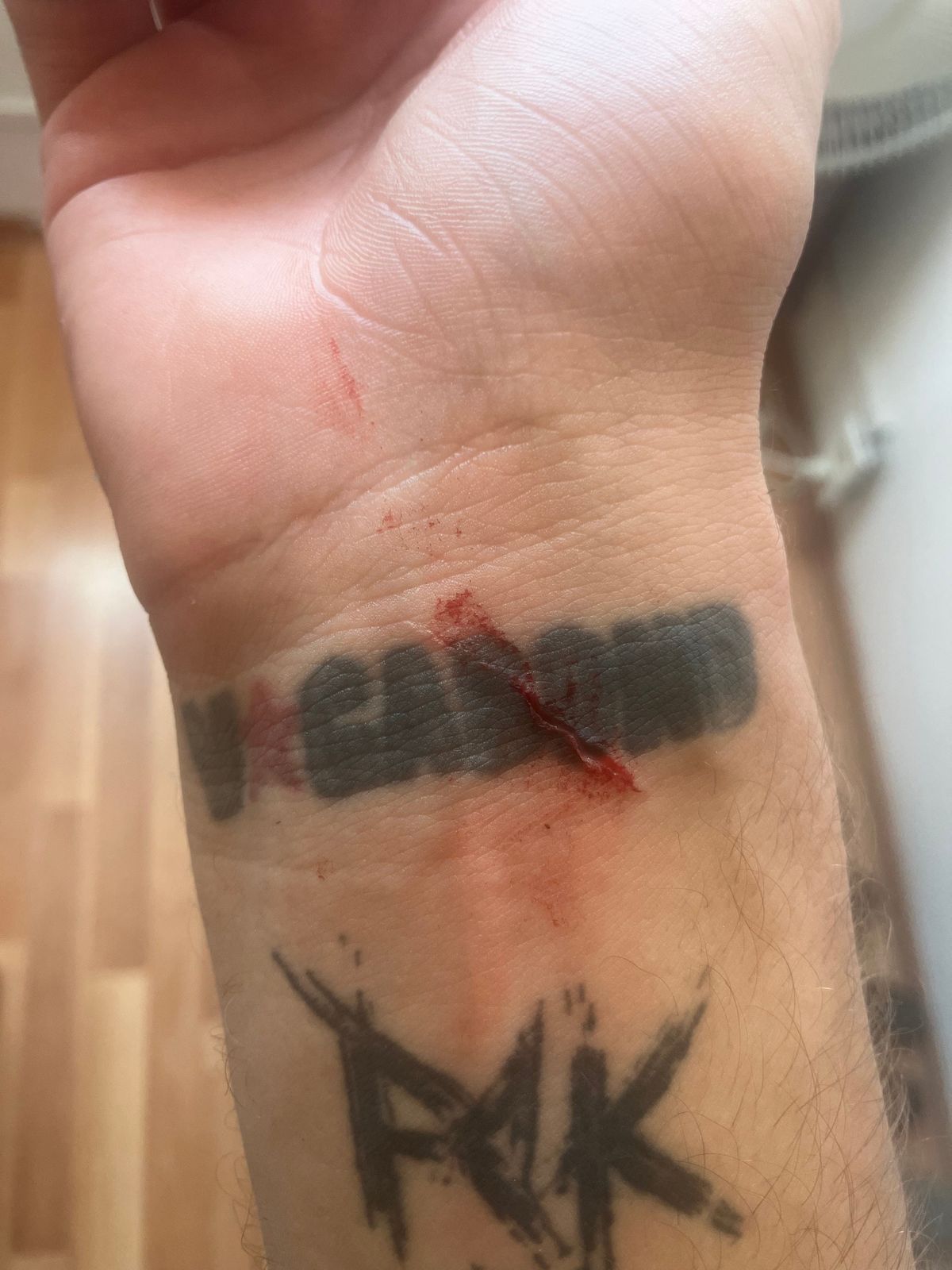 Když jsme se vrátili domů, jal jsem se balit si věci. Vtom jsem si všimnul červeného fleku na kapse riflí. Nechápal jsem, od čeho pochází. A pak jsem zahlédnul svoje krvácející zápěstí. Nápisem Vagabond, co jsem si nechal vytetovat, když jsem před lety absolvoval svou první cestu Mexikem, procházela dvoucentimetrová rána a z ní vtékala krev. Nepamatuji se, o co bych se říznul a kdy.