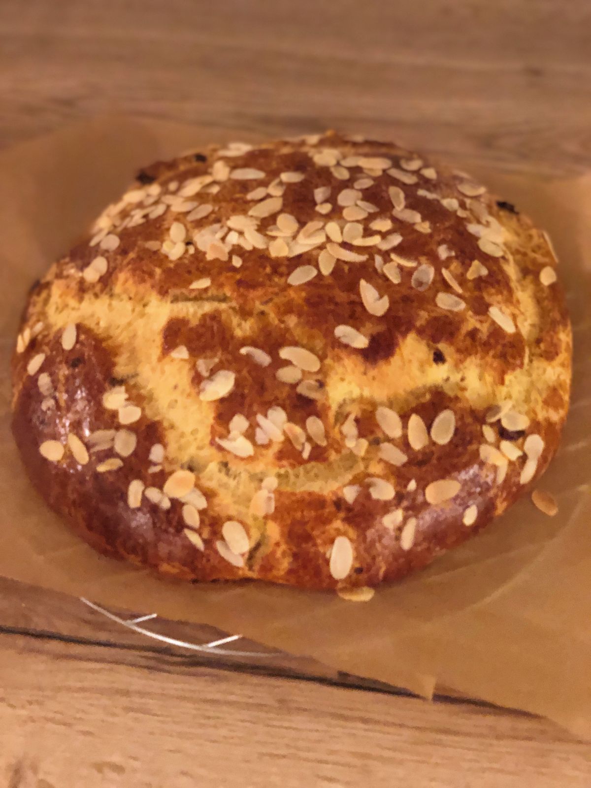Vykynuté těsto vyklopím na lehce pomoučenou pracovní plochu a krátce ho propracuju. Vytvaruju jeden velký hladký bochánek, který přenesu na plech vyložený pečicím papírem. Přikryju utěrkou a nechám ještě asi 40 minut kynout.