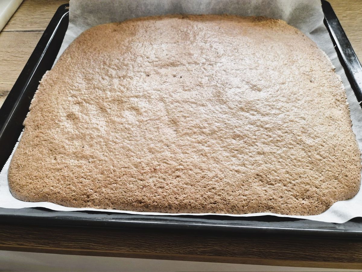Ihned po upečení plát překlopím na čistou utěrku, stáhnu pečicí papír a ještě teplý ho i s utěrkou opatrně sroluji. Lze ho srolovat přímo na pečicím papíře.
