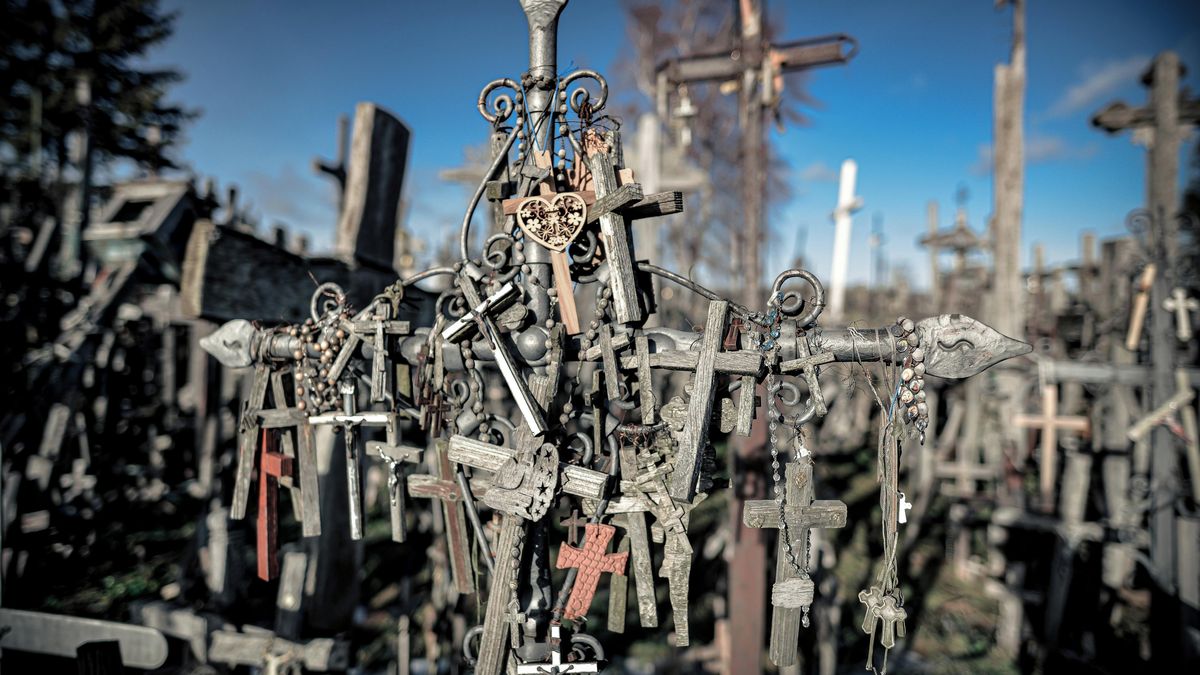 Když jsem přicházel po nenápadné cestě od parkoviště, krajina byla téměř plochá, otevřená a lehce zvlněná, jak je pro sever Litvy typické. A pak se přede mnou začaly objevovat obrysy, nejdřív jednotlivé kříže, pak desítky, a nakonec celé husté pole, které se zvedalo do malého kopce a splývalo v podivuhodnou změť dřeva, kovu a růženců.
