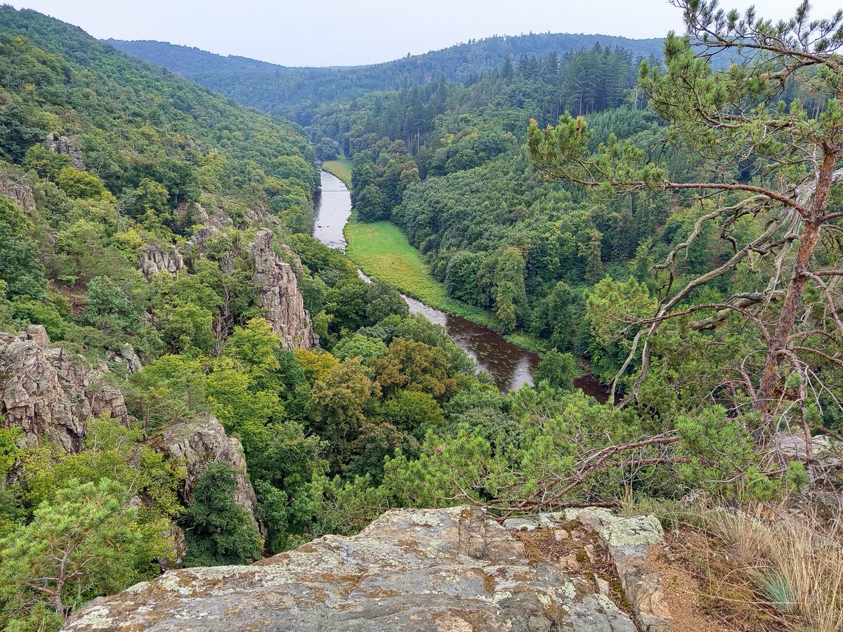 O 1,5 km dále se nachází vyhlídka Velká skála. Z té se mi naskytne pohled na stejnojmenný skalní útvar, lesy, jež dávají tušit, kudy se klikatí řeka nebo na jadernou elektrárnu Dukovany.